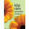Kliprám rozměru 13x18 centimetrů s antireflexním sklem, které je z jedné strany matné a proto neodráží nežádoucí světelné odlesky. Zadní deska kliprámu je vyrobena z MDF. Sklo se zabroušenými hranami je k ní přichyceno kovovou sponou na každé straně. Vložený papír je z druhé strany bílý a můžete ho použít jako podklad pro vložený obrázek. Klip rám pověsíte na zeď pomocí otvoru ve sponě. Podrobnosti o použití najdete v článku Euroklip neboli kliprám.