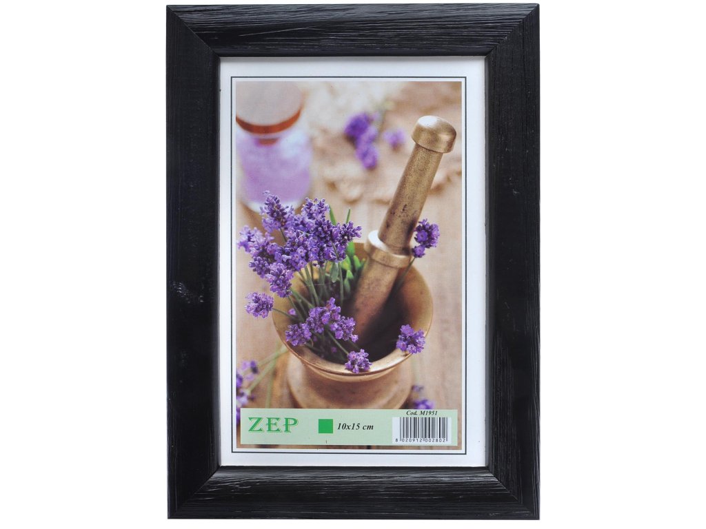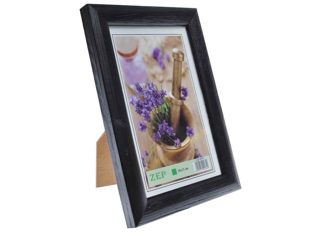 Dřevěný rámeček černé barvy s dobře viditelnou strukturou dřeva a se sklem. Skvěle se v něm budou vyjímat jak barevné, tak i černobílé fotky. Určen pro obrázky 10x15 centimetrů. Lišta rámečku je 18mm široká a 14mm hluboká. Na zadní straně najdete uchycení pro zavěšení na stěnu, nebo stojánek pro postavení.