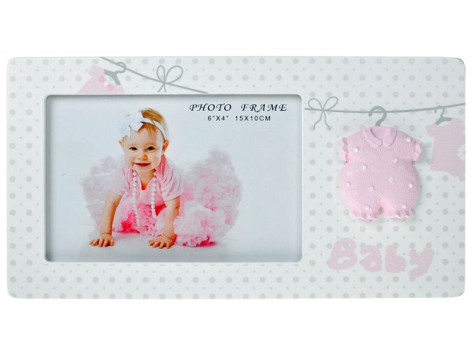 Rámeček na dětskou fotografii 10x15 s šatičkami v růžovém provedení. K postavení na rovnou plochu.