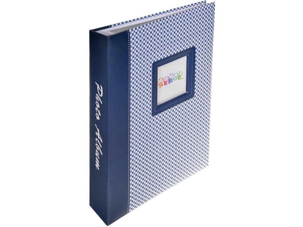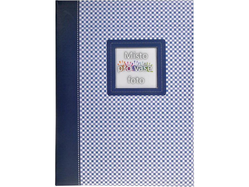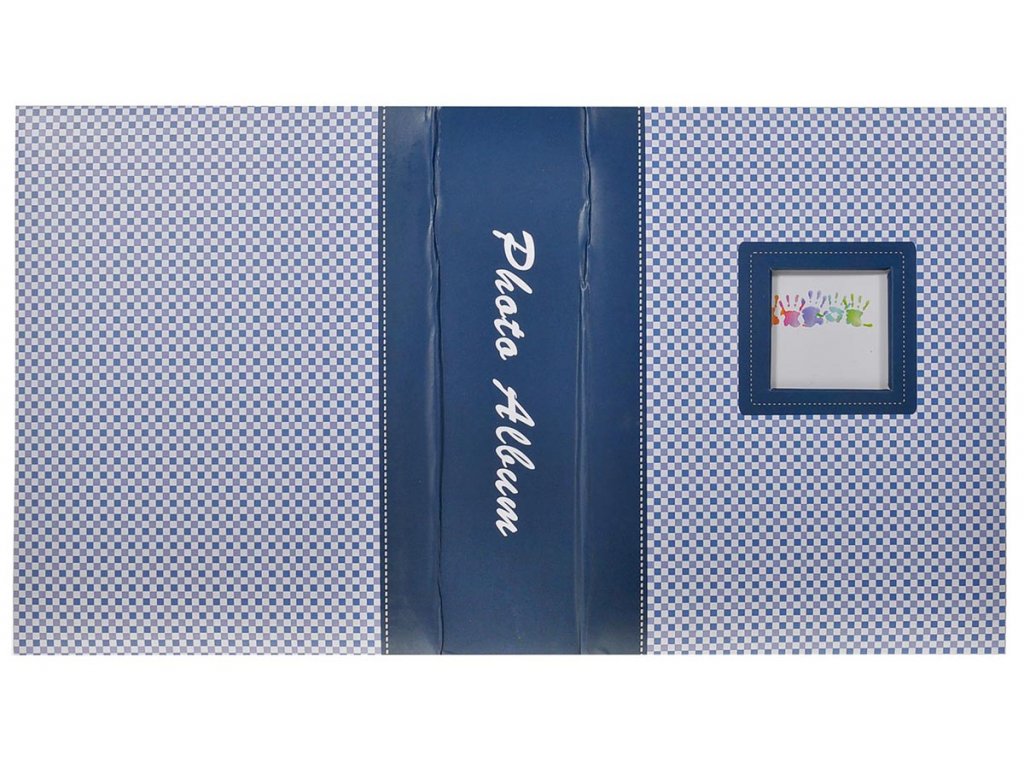Fotoalbum s jemným kostičkovom dizajnom pre 200 fotografií 13x18 cm v modrom prevedení. Na prednej doske albumu je otvor pre vloženie vlastné fotografie, tým si album prispôsobíte a budete ho mať ešte viac radi. Pre uloženie fotiek slúži systém priehľadných zasúvacích vreciek.