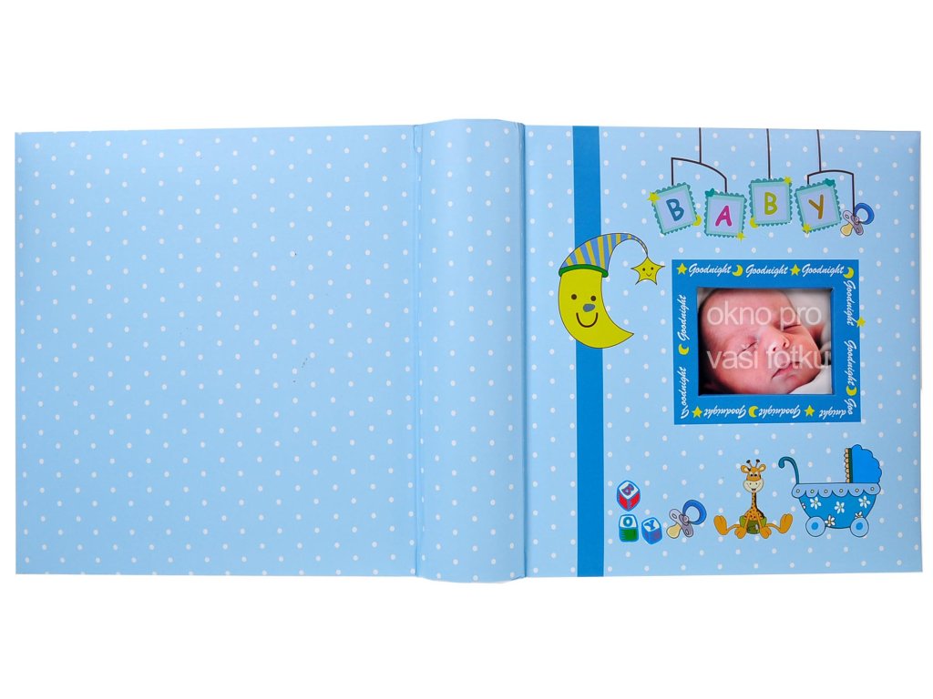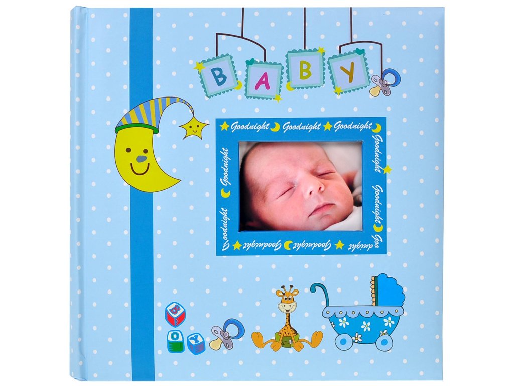 Fotoalbum pre fotografie bábätiek a batoliat v modrej farbe. Na doskách má pekný motív mesiačku a okienko pre vloženie fotky vlastného bábätka. Systém priehľadných vreciek na papierových hárkoch k zasúvaní fotiek a miestom na popis vedľa každého obrázku. Do albumu sa zmestí 200 fotiek 10x15.