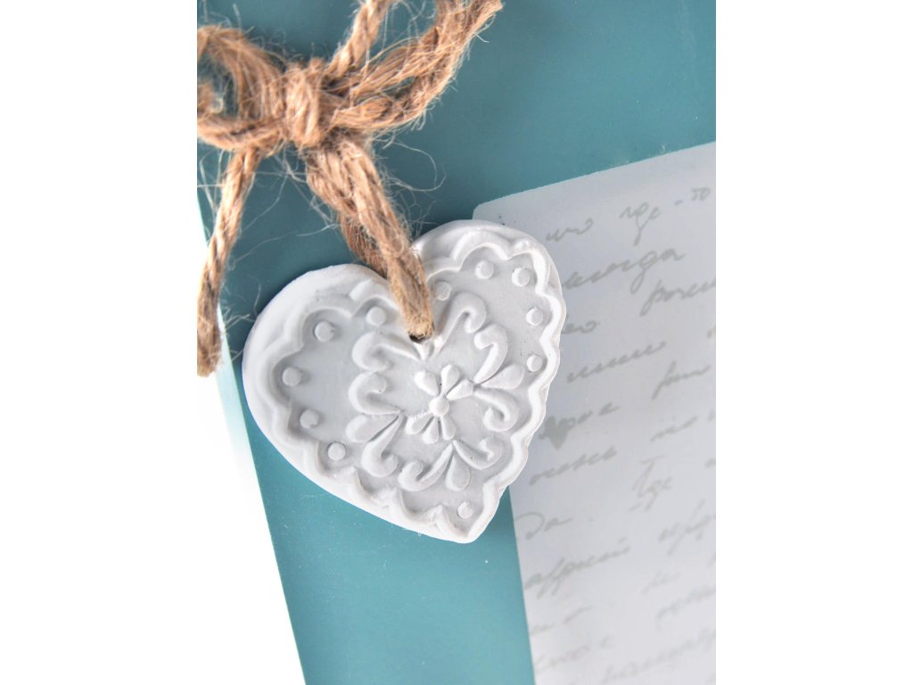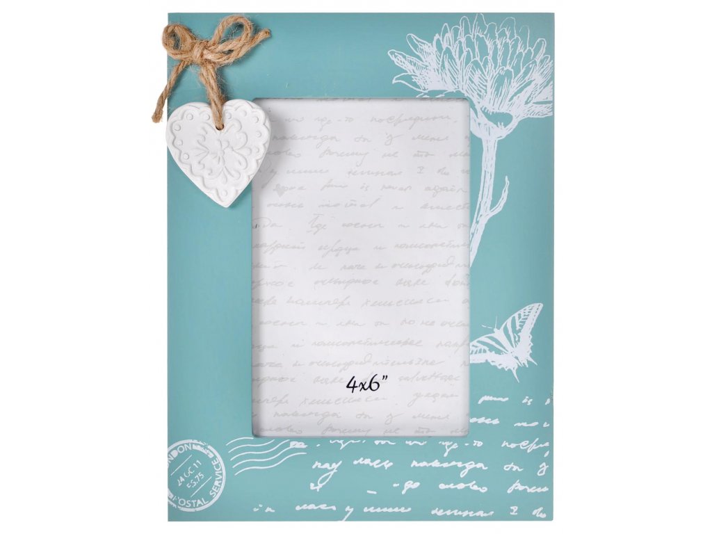 Rámček Mimosa modrozelenej farby. Cestovateľský motív na rámčeku je doplnený srdiečkom na prírodnom povrázku. Vhodný pre romantickú fotografiu 10x15 na výšku.