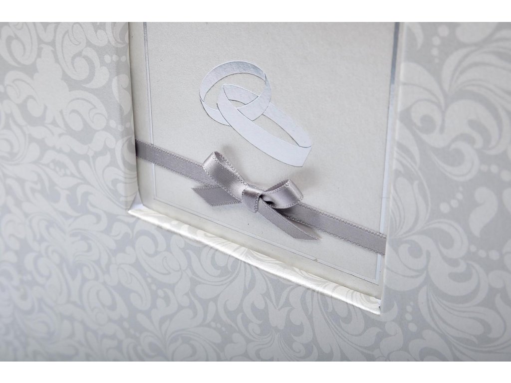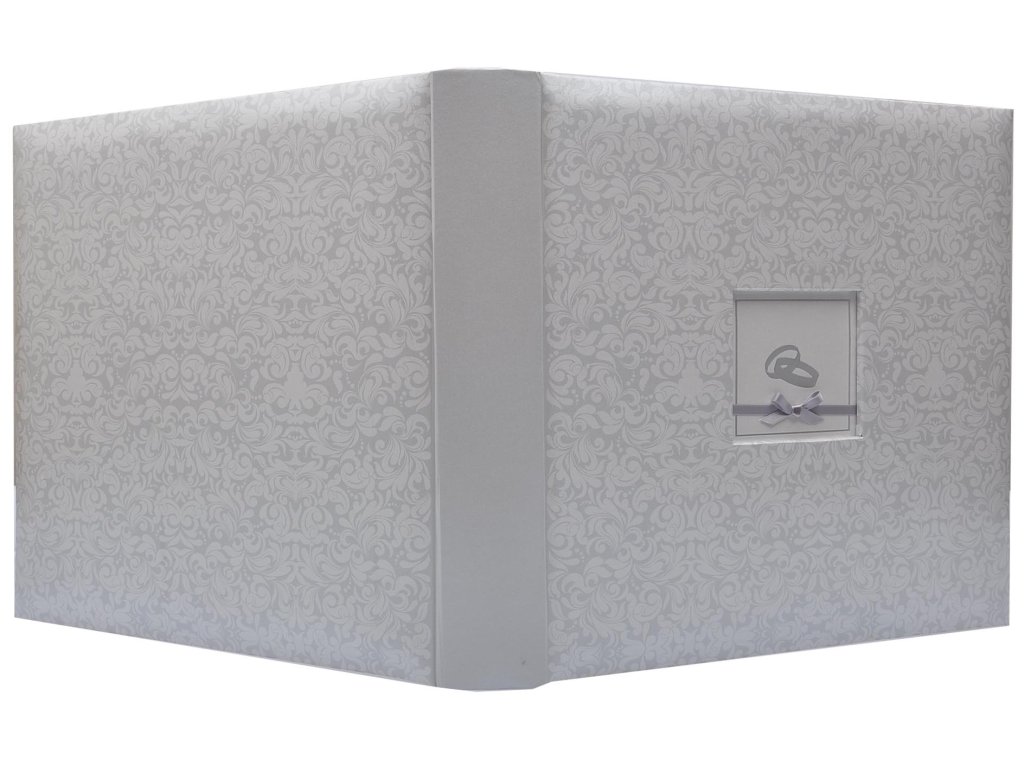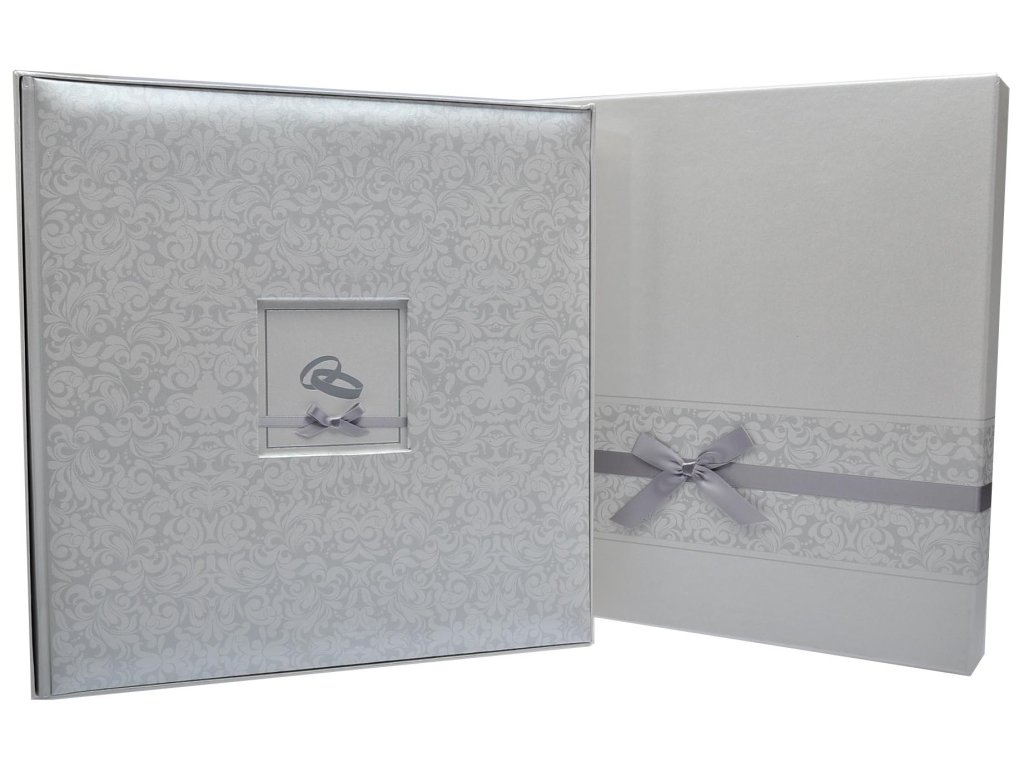 Luxusné svadobné šité fotoalbum Caterina, naozaj veľkorysých rozmerov, na uloženie fotografií z vášho svadobného dňa. Vďaka veľkosti 33x33 cm pojme naozaj nezvyčajné množstvo fotiek. Obsahuje 100 strán (50 listov) medzi ktorými je jemný papier pre lepšiu ochranu fotiek. Dosky sú potiahnuté lesklým poťahom s jemnou štruktúrou a vpredu má album okienka na vloženie vlastnej fotky. Album je uložené k pevnej kvalitnej krabici s rovnakým poťahom a mašličkou ako album. Detailné informácie o rozmeroch foto albumu nájdete v schéme medzi fotografiami.