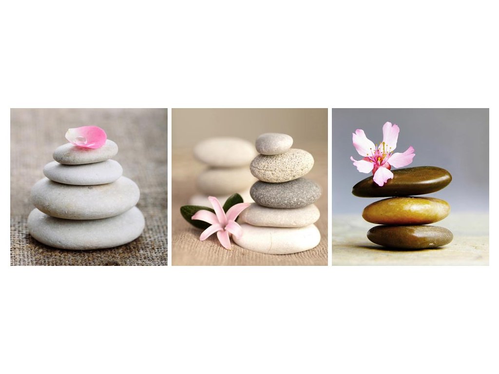 Triptych Kamienky - fotografia vytlačená na plátne a natiahnutá na drevenom ráme. Tri rámčeky 20x20 cm v jednom obraze. Veľa možností usporiadania zavesenia na stenu. Menší rozmer obrazu je vhodný pre použitie do malých priestorov ako môže byť napríklad kúpeľňa alebo predsieň.