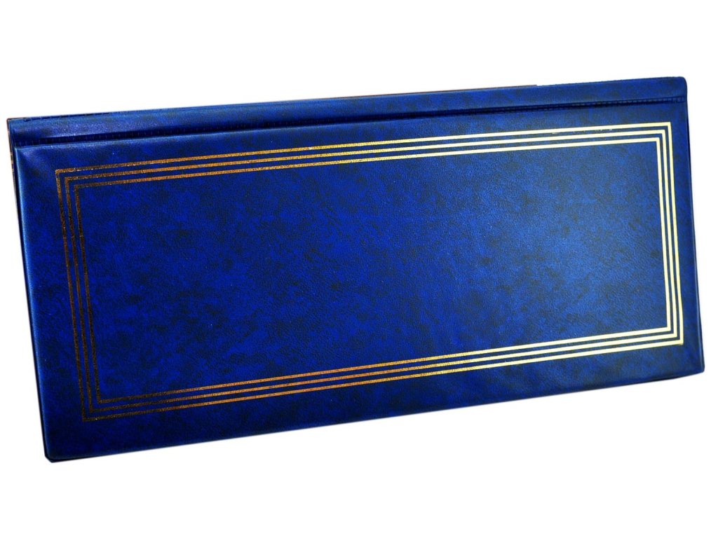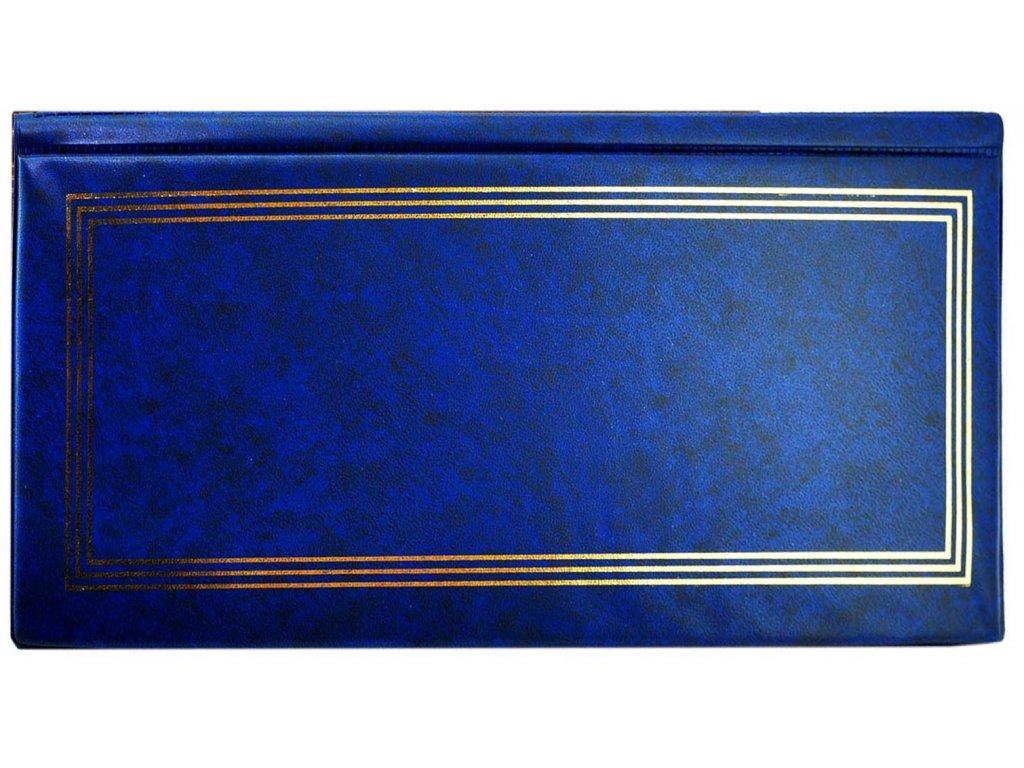 Malé koženkové zasúvacie album na špeciálne panoramatické fotografie veľkosti 10,5x26 cm. Modrá farba s jemnou zlatou aplikáciou.