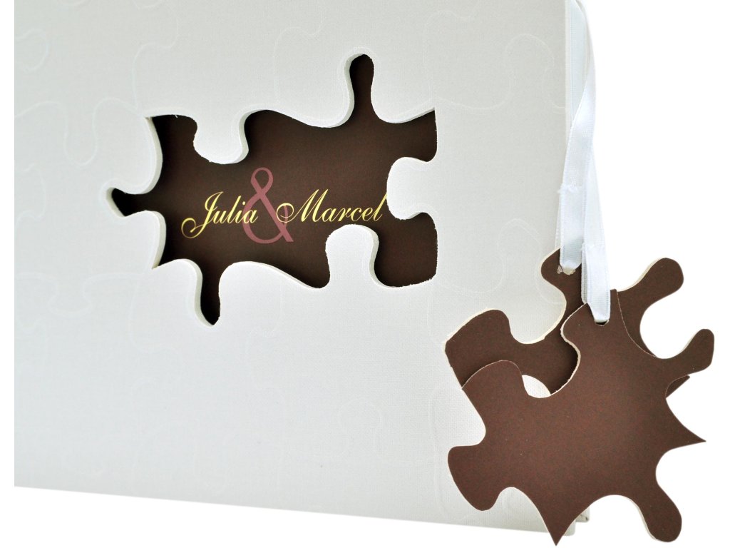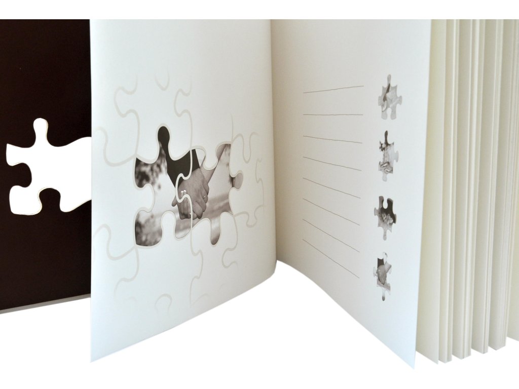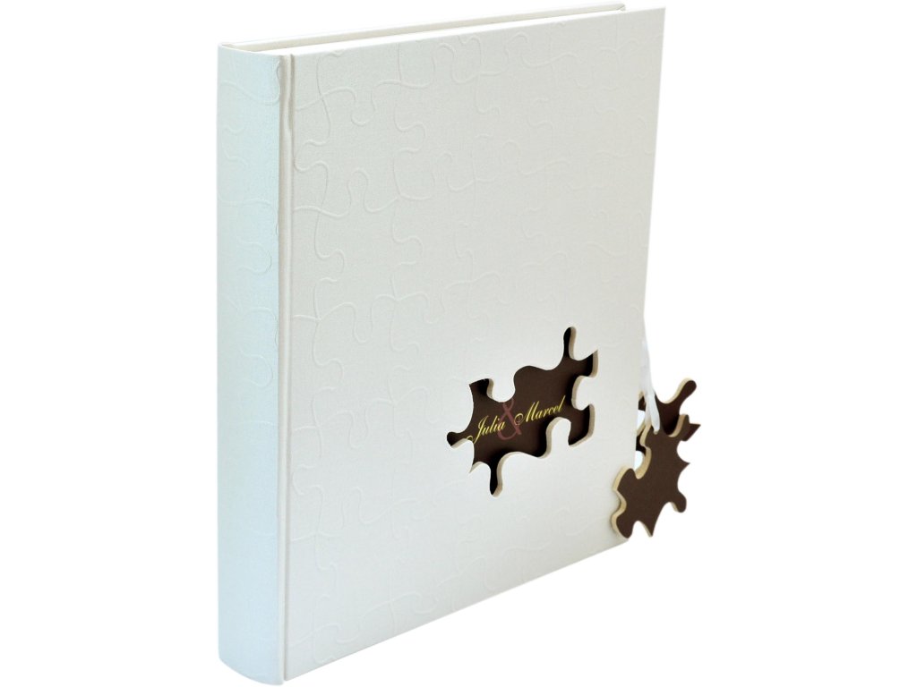 Klasický album s tvrdým obalom smotanovej farby s plastickým motívom puzzle, ktorý je použitý aj na ozdobných stuhách, s čokoládovo hnedou predsádkou a voľným listom. Listy vo vnútri sú oddelené pergamenovým papierom. Veľkosť albumu je 28x30 cm. Je určený pre 224 fotografií s rozmermi 10x15 cm alebo 112 fotografií 13x18 cm. Fotorožky a podlepky nájdete v kategórii Príslušenstvo.