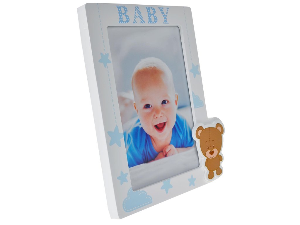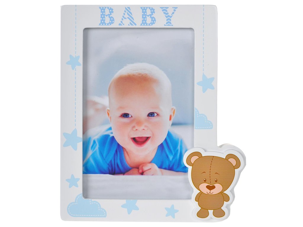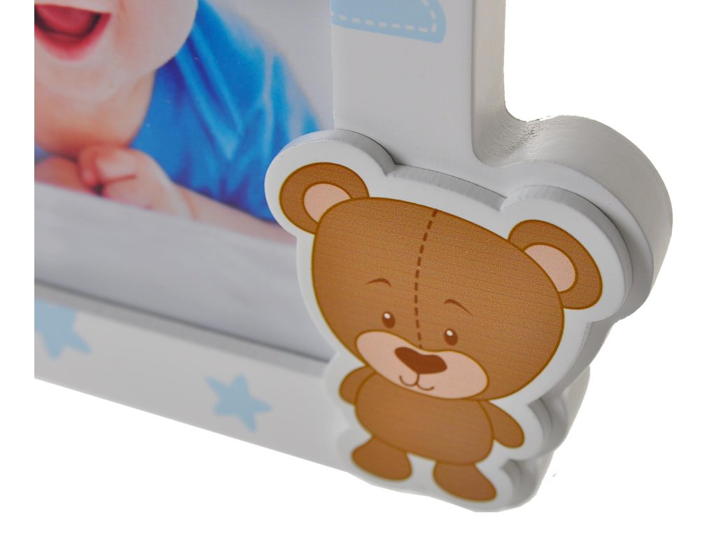 Roztomilý rámček Aron s medvedíkom, najmä pre fotky vašich detí a vďaka farbe hlavne pre chlapcov. Vhodný pre fotografiu 10x15 a na postavenie na rovnú plochu.