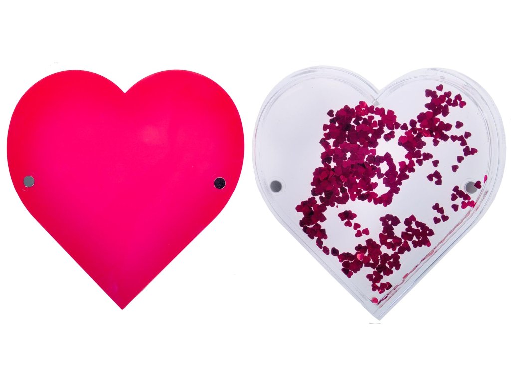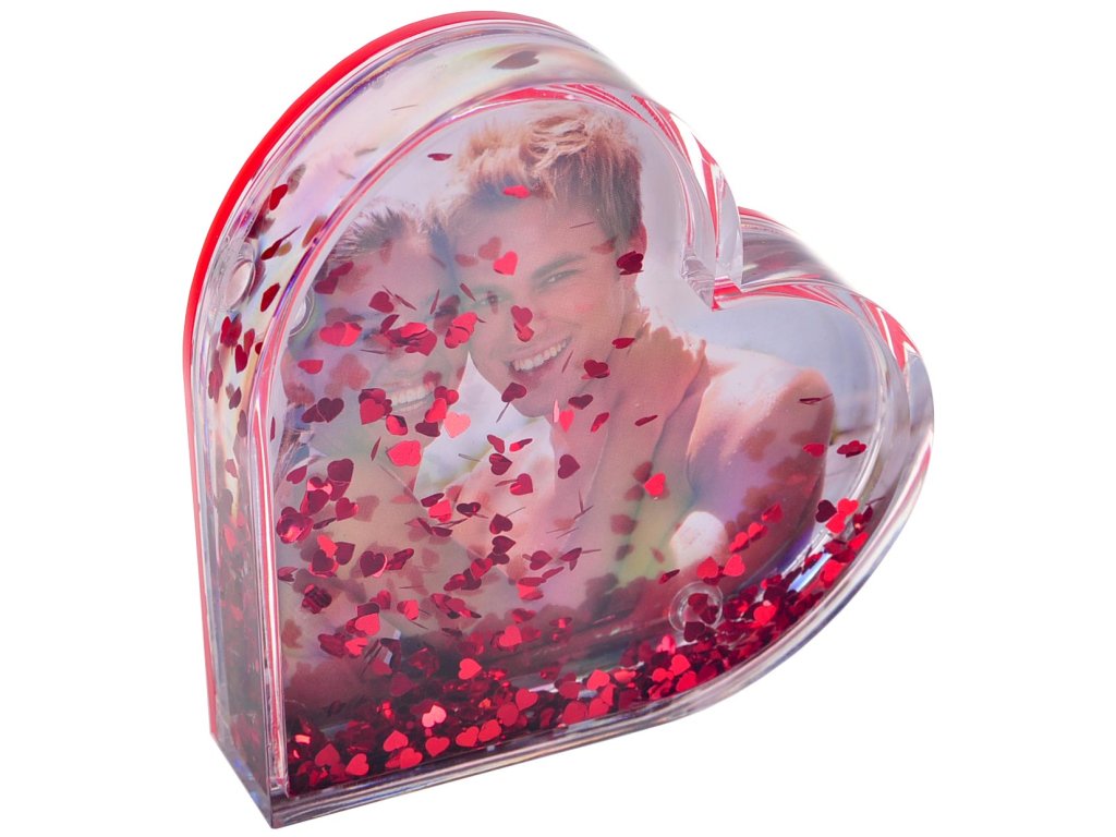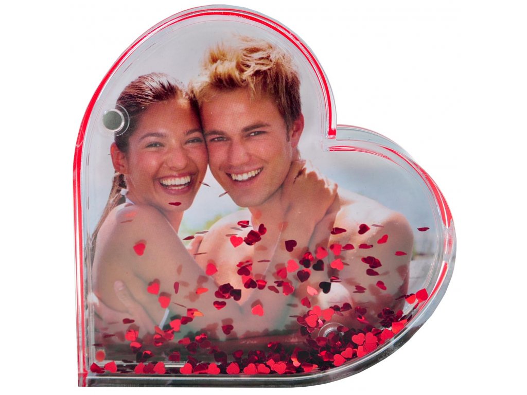 Rámik typu ťažidlo-snežidlo v tvare srdca. Na fotografie s rozmermi 9,5x9,5 cm zamilovaných párov, srdečných ľudí, zvierat, áut a podobne. Zadnú a prednú stranu, medzi kterými je fotografia, držia dva silné magnety. Výmena fotografie vašich obľúbencov je preto veľmi jednoduchá a rýchla.